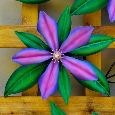 These designs are created with various combinations of Aluminum, Copper, Steel, Cedar, Acrylic paints, and Patinas. The metal being fashioned with areas of high and low Relief, similar to Repoussé, creating a sense of reality. Leaves and Flowers are cut from thin sheet metal, sanded, welded, primed, Airbrushed and finished with multiple clear coats. Branches and Vines are Copper/Copper Cladded Steel, finished with Patinas and clear coats. Lattices are fashioned from Cedar.